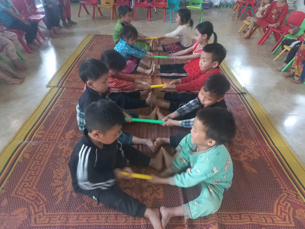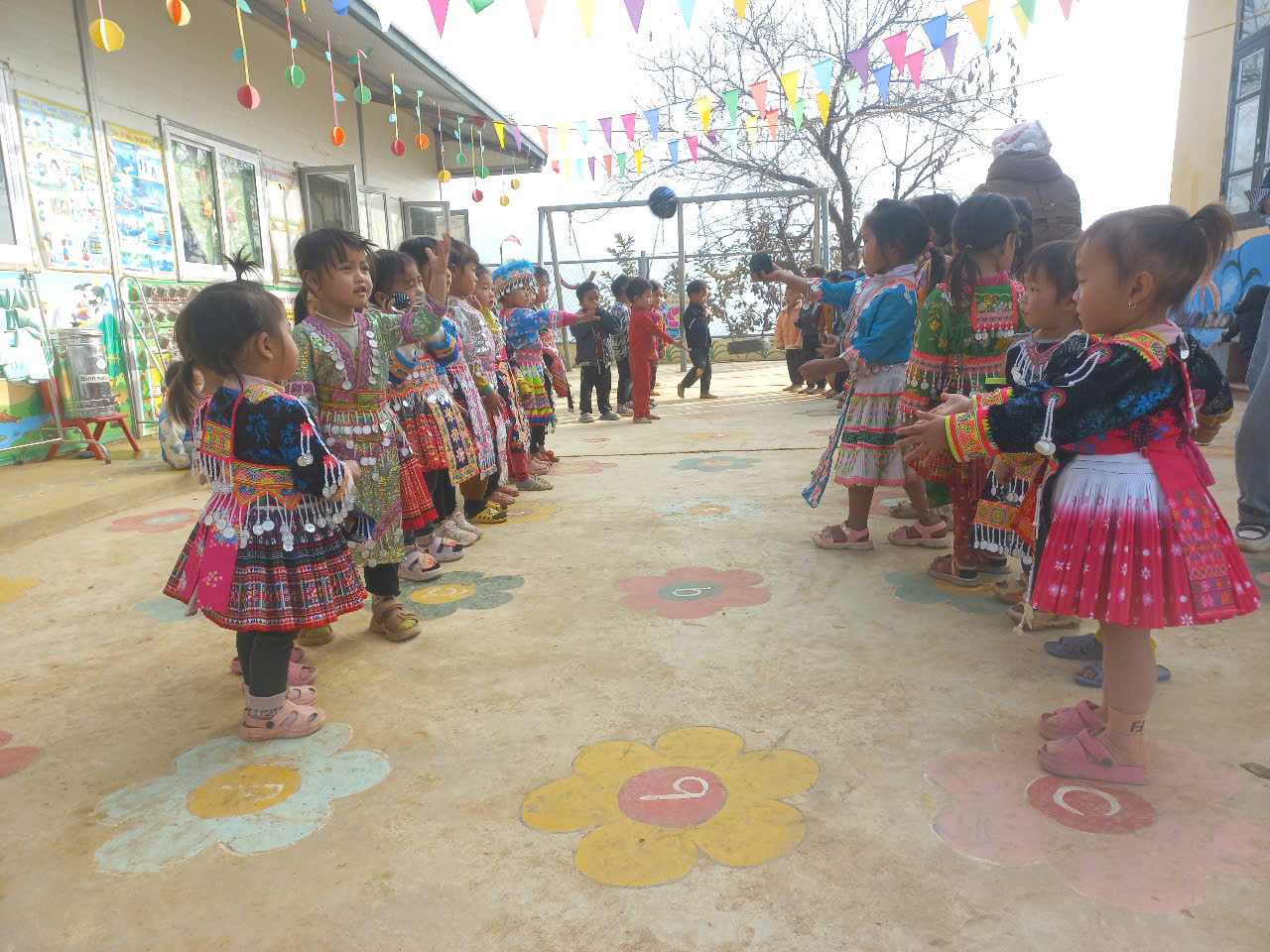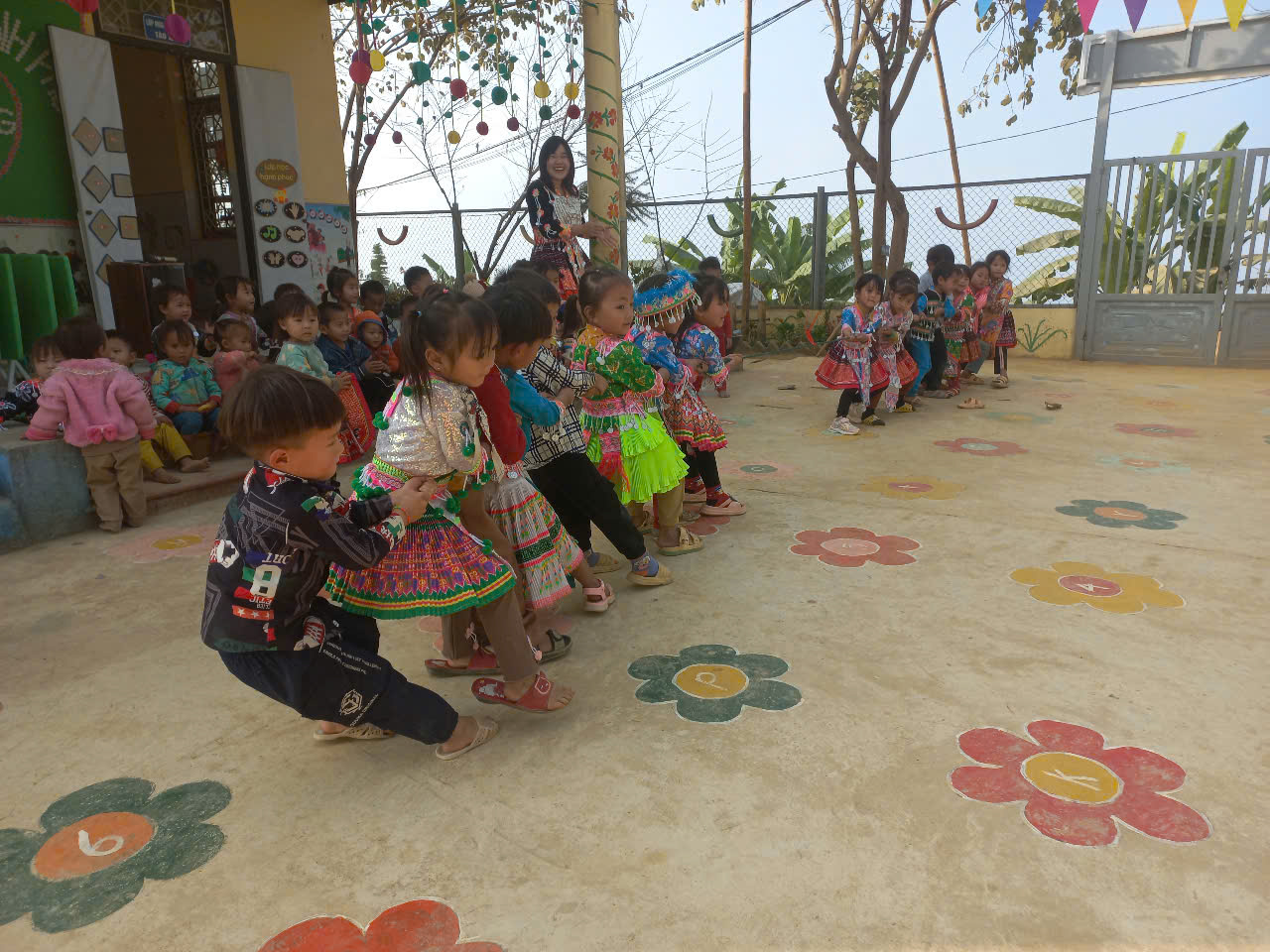 Khi tổ chức cho trẻ chơi chúng tôi sẽ tổ chức cho trẻ chơi đọc lời theo cả tiếng dân tộc Mông và tiếng Việt, để trẻ phát triển song song cả 2 ngôn ngữ, tăng cường tiếng việt cho trẻ.